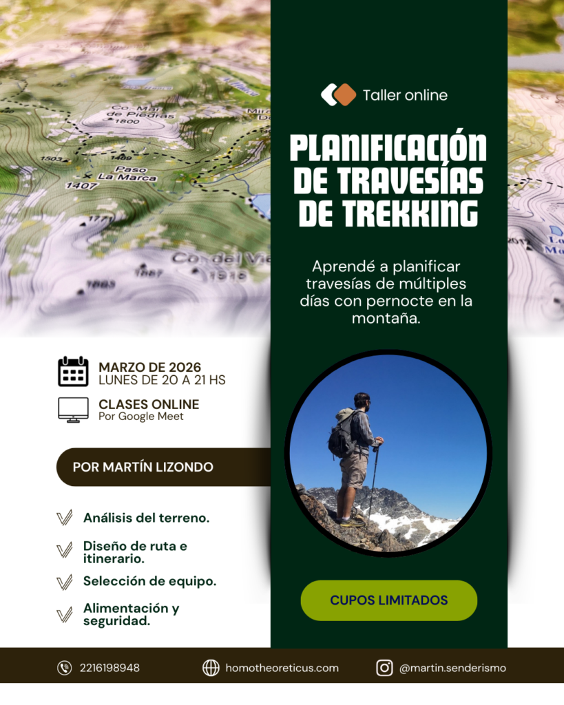 En esta tercera edición del taller abordaremos herramientas esenciales para la planificación de travesías de trekking con pernocte de varios días en terreno de media montaña, utilizando para ello los recursos más modernos disponibles. Será brindado por Martín Lizondo a lo largo de cuatro encuentros virtuales, en los que se abordarán aspectos como el análisis del terreno, consideraciones del clima, diseño de itinerarios, criterios para la elección de equipo, indumentaria, alimentación, etc. Quienes se inscriban pero no puedan asistir online, tendrán acceso a las clases grabadas.
